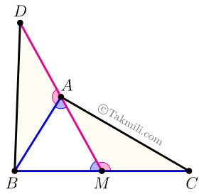پاسخ تشریحی بنابه فرض مسئله $AB=BM$؛ یعنی مثلث $ABM$ متساویالساقین است. پس بنابه قضیهٔ مثلث متساویالساقین داریم: \[B\widehat{A}M=B\widehat{M}A.\quad (1)\] بنابراین مکمل دو زاویهٔ بالا نیز برابرند؛ یعنی \[B\widehat{A}D=A\widehat{M}C.\quad (2)\]